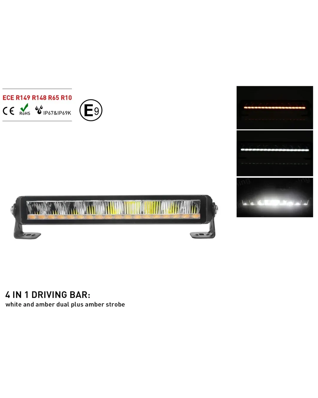 Работно напрежение: 10 ~ 30 VВодоустойчив: IP67 / IP69KСертификати за качество: ECE-R10 , ECE-R65 , ECE-R148 , ECE-R149Дневна Светлина: 50W / 9 LEDАварийна Светлина: 8W / 18 LEDБял/Оранжев Габарит: 1.7W / 18 LEDСветлинен поток: 2100LM