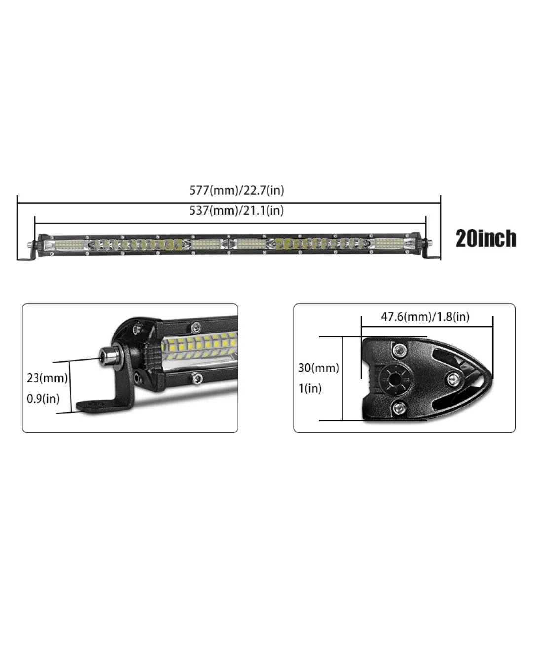 Спецификации:Мощност: 78W Брой LED: 54Материал: АлуминийЦвят: ЧеренВолтаж: 9-30VРазмери:Дължина: 57,7 смДълбочина: 2,3 смШирочина: 3 см