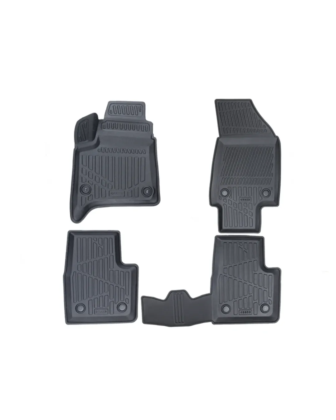 Пълен комплект от 4 стелки (предни + задни), изработени специално за този модел. Високият борд тип „леген“ хваща водата, калта, снега и праха още при влизане и не ги пуска до оригиналния мокет.