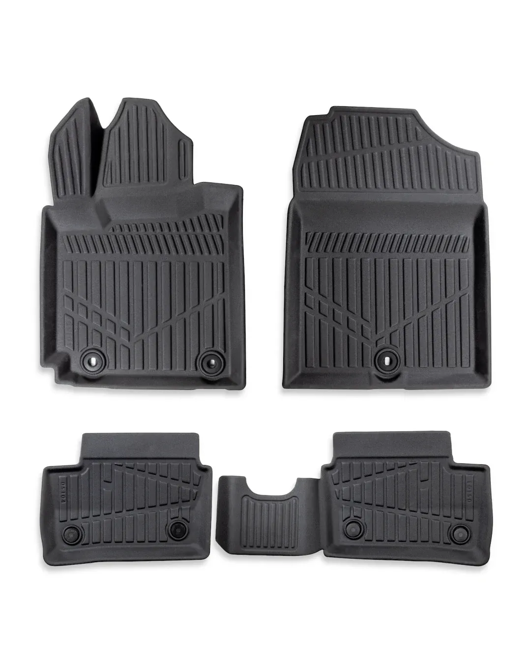 Пълен комплект от 4 стелки (предни + задни) с висок борд тип „леген“. Хващат водата, калта, снега и праха още на входа и не ги пускат до оригиналния мокет - супер практично за малка кола, в която постоянно влизат и излизат.
