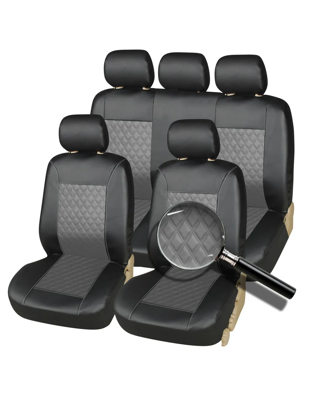 Комплект Калъфи/тапицерия за автомобил за предни и задни седалки, Еко кожа, Черно и Сиво