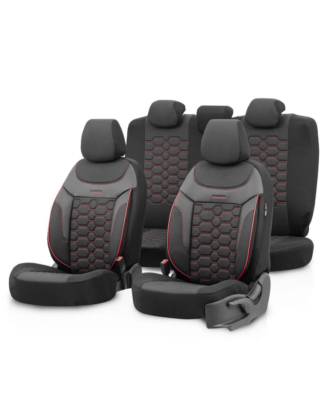 Комплект Луксозна Тапицерия OTOM текстил с еко кожа CARBON Design – Черна с червен шев, за Предни и Задни Седалки