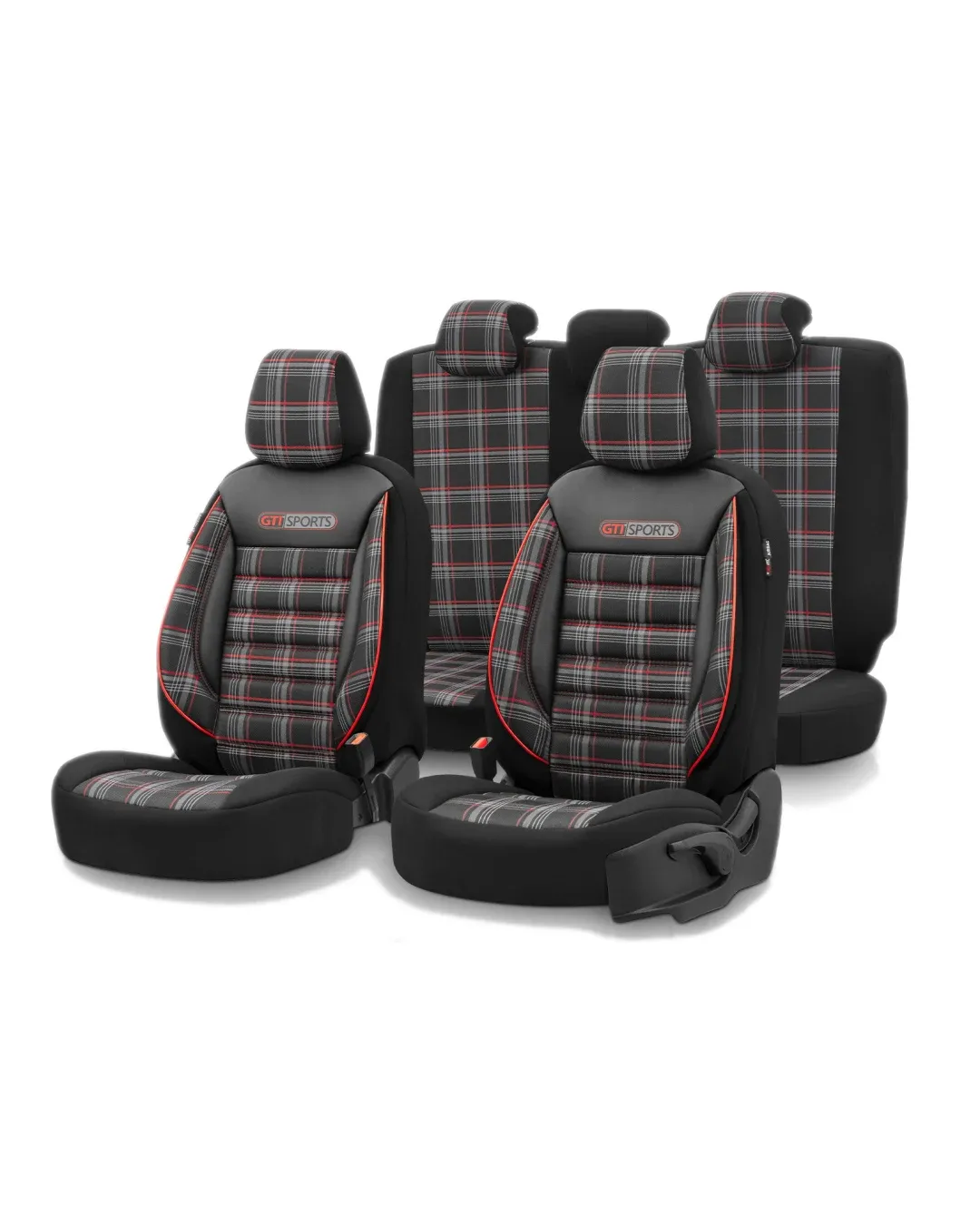 Комплект Луксозна Тапицерия OTOM текстил с еко кожа GTI SPORTS Design – Черна с червен шев, за Предни и Задни Седалки
