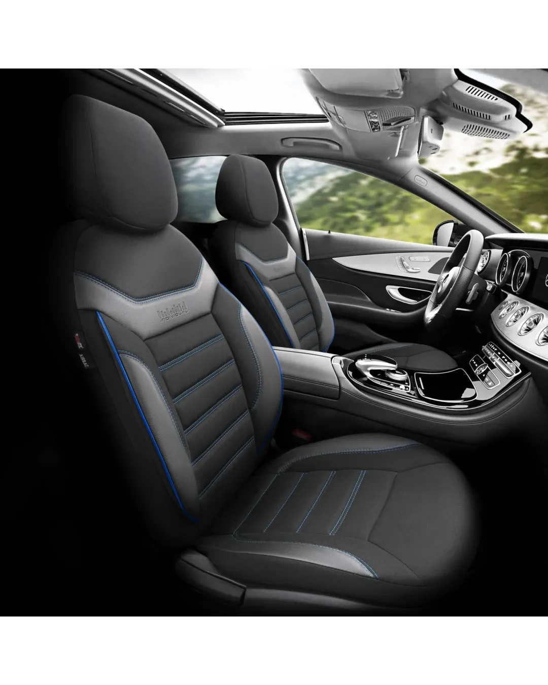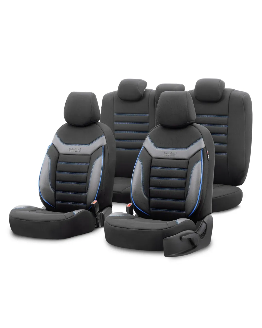 Комплект Луксозна Тапицерия OTOM текстил с еко кожа INDIVIDUAL Design – Черна със син шев, за Предни и Задни Седалки