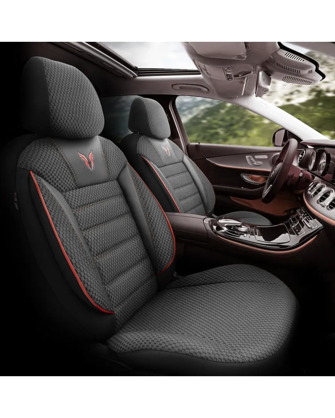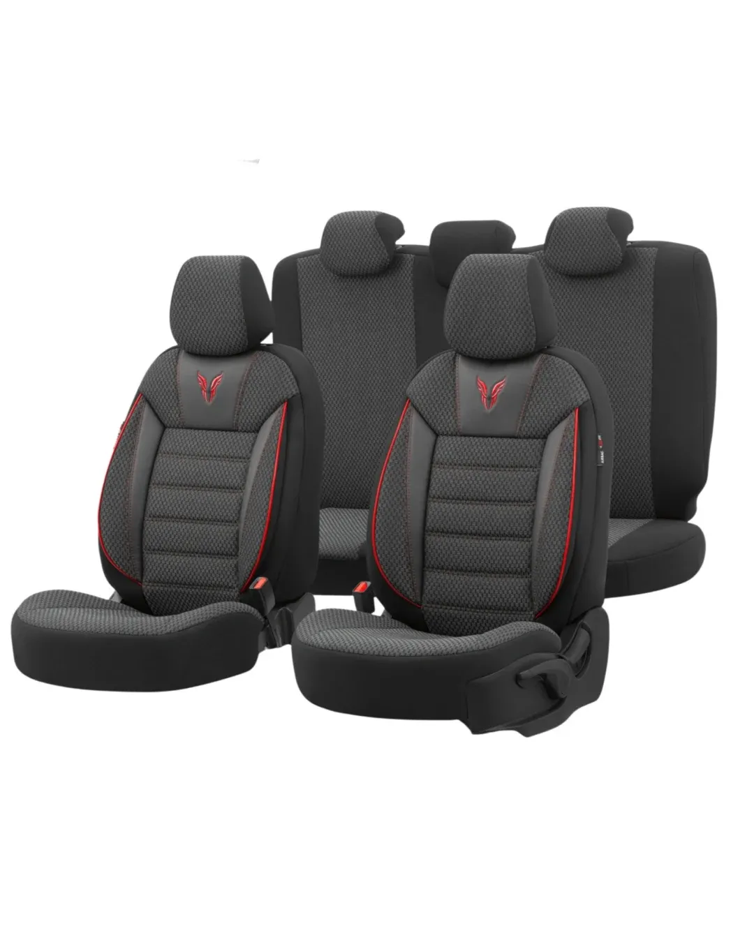 Комплект Луксозна Тапицерия OTOM текстил с еко кожа TORO Design – Черна с червен шев, за Предни и Задни Седалки