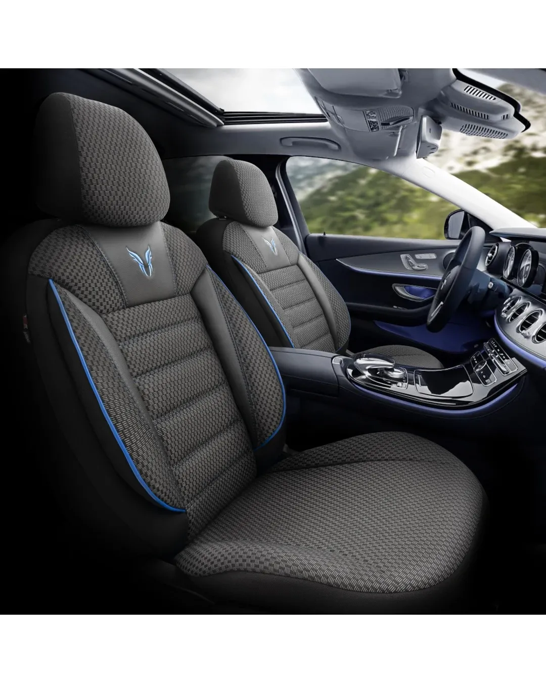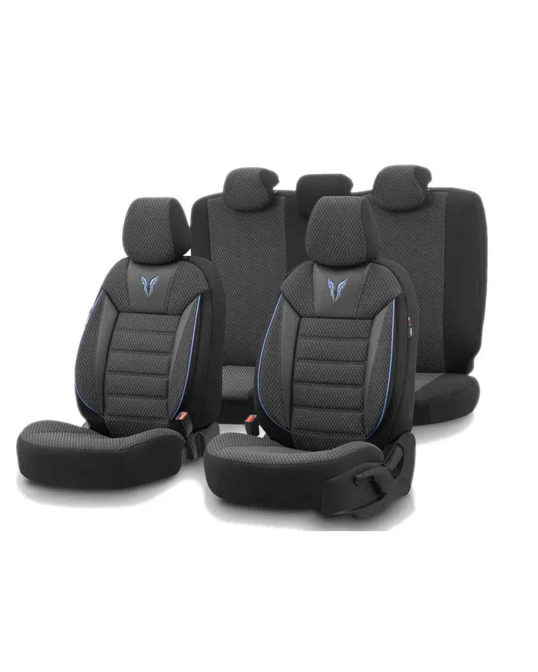 Комплект Луксозна Тапицерия OTOM текстил с еко кожа TORO Design – Черна със син шев, за Предни и Задни Седалки