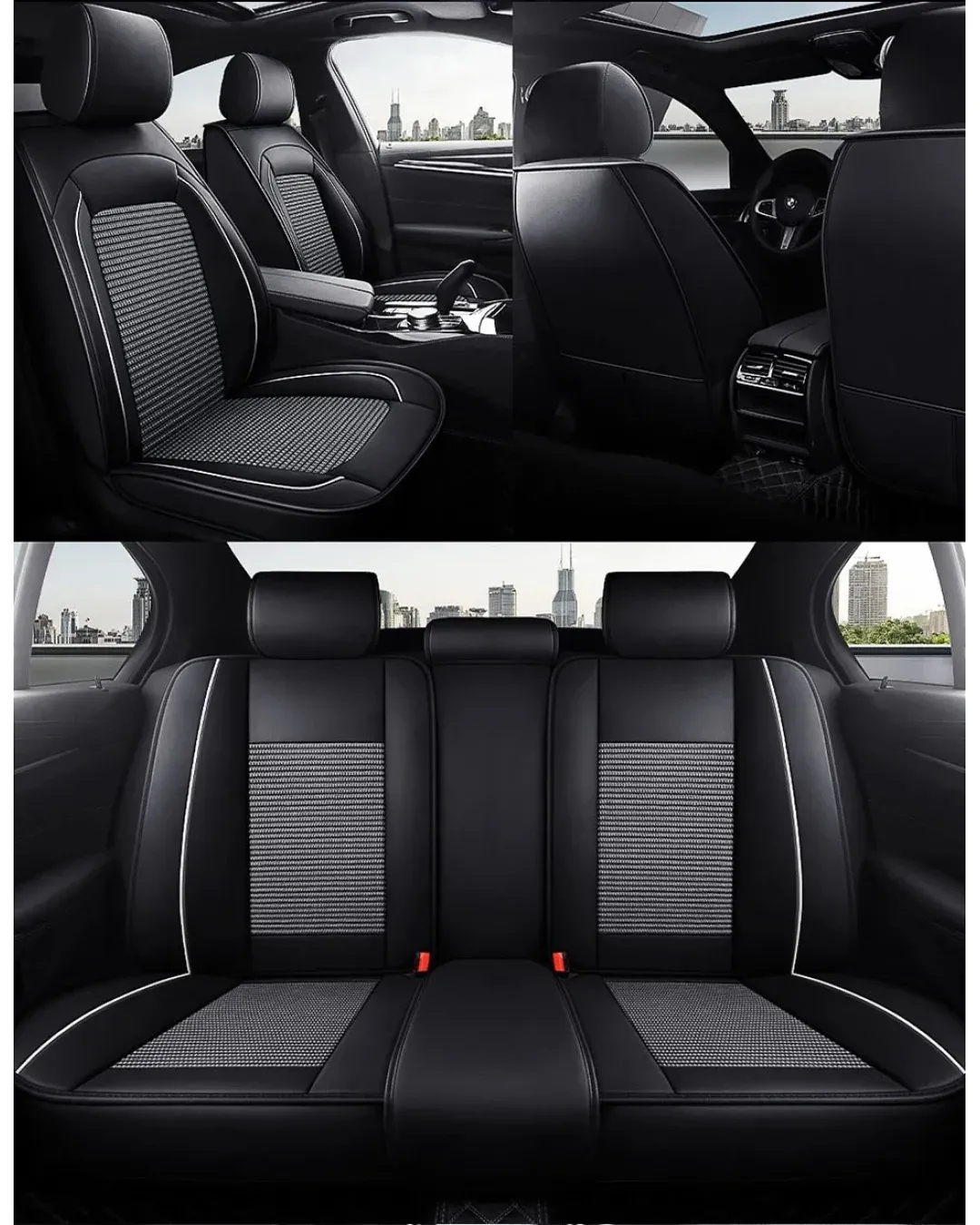 Комплект Луксозна универсална тапицерия кожа с текстил, Черна с бял кант за Предни и Задни седалки