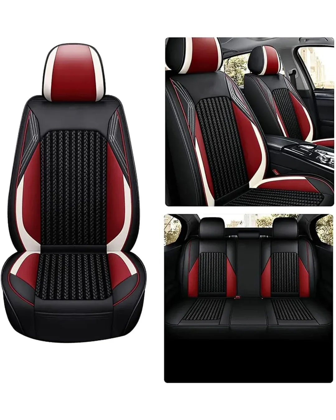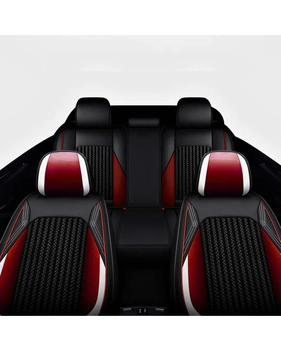 Комплект Луксозна универсална тапицерия кожа с текстил, Черна с червен и бял акцент, За Предни и Задни седалки