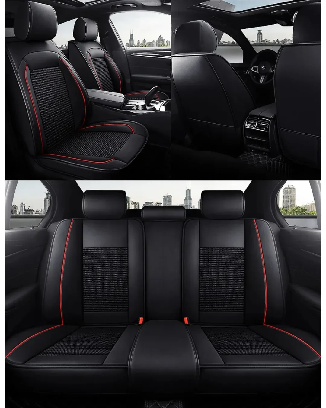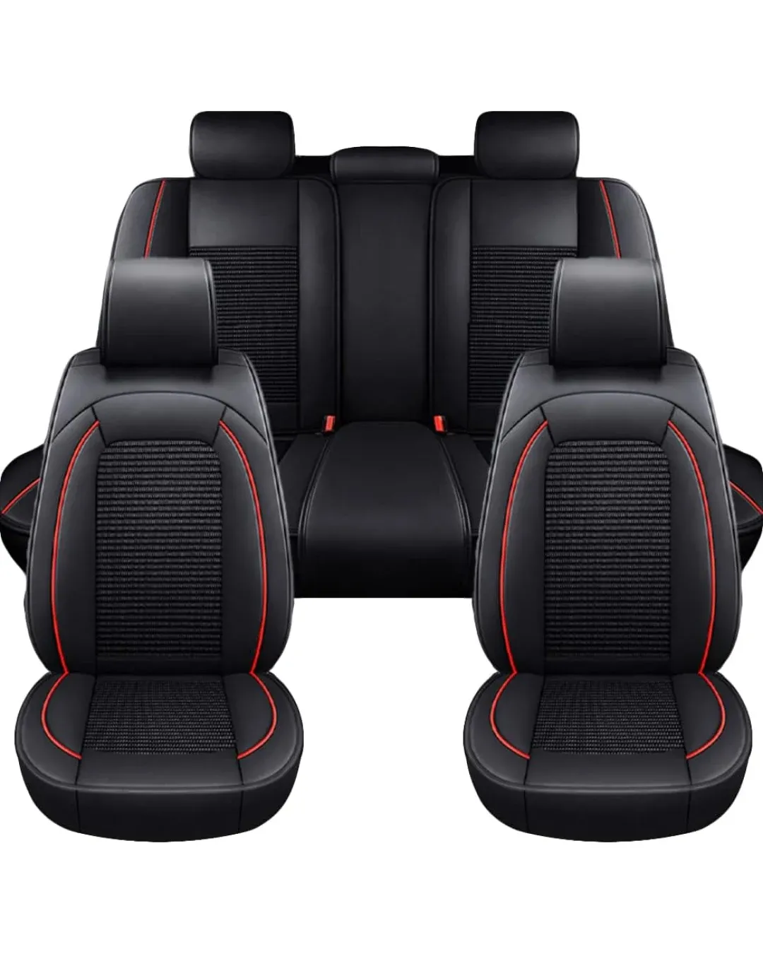 Комплект Луксозна универсална тапицерия кожа с текстил, Черна с червен шев за Предни и Задни седалки