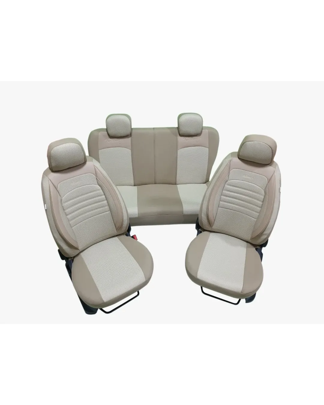 Луксозна тапицерия Изработени от висококачествен плат и изкусвена кожа , осигуряват удобно чувство за сядане. Ръчно шити. Универсален дизайн, подходящ за всички автомобили. Дизайн, съвместим с airbag - въздушни възглавници. Устойчивост на износване Лесна инсталация. Цялостен дизайн, покрива предната и задната част на седалката. Пакет, включващ: 8 части, предни и задни. Цвят -Бежов