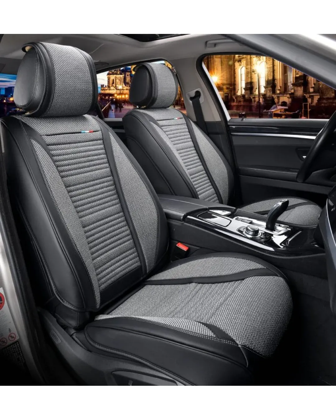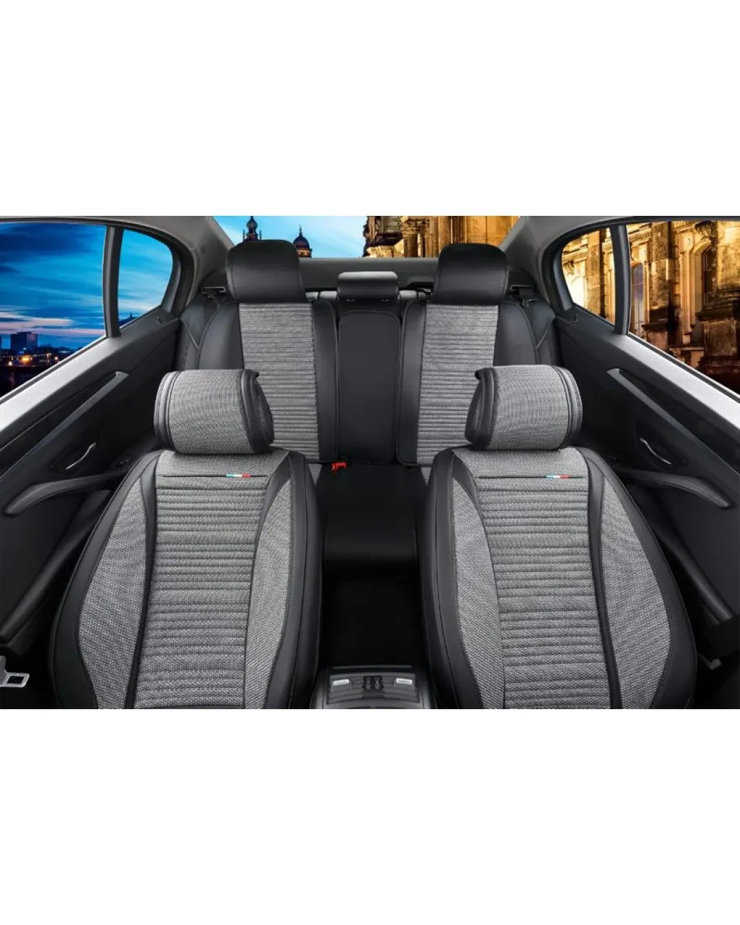 Висококачествена пълен комплект сива тапицерия изработена от висококачествен плат и ЕКО кожа Универсален дизайн, подходящ за всички автомобили Дизайн, съвместим с airbag - въздушни възглавници. Устойчивост на износване, добър водоустойчив ефект и силна огнезащитна способност. Лесна инсталация. Цялостен дизайн, покрива предната и задната част на седалката. Пакет, включващ: 2 предни и 3 задни калъфа за седалки