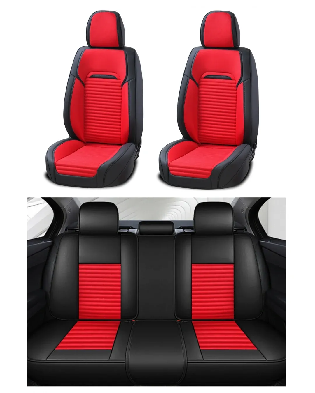 Пълен Комплект Универсална Тапицерия, Калъфи За Автомобилни Седалки Лукс Еко Кожа и Висококачествен Текстил в Черно и Червено