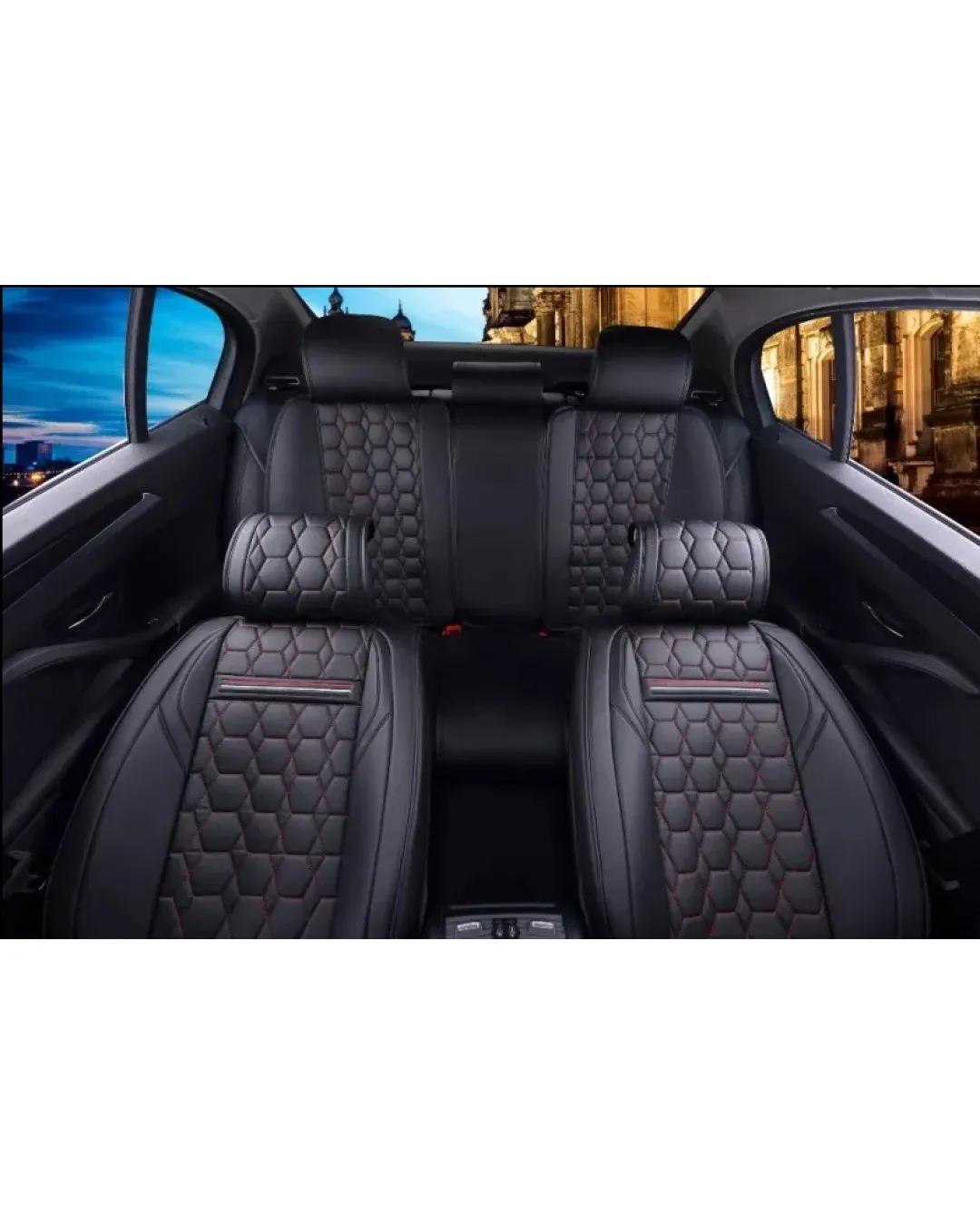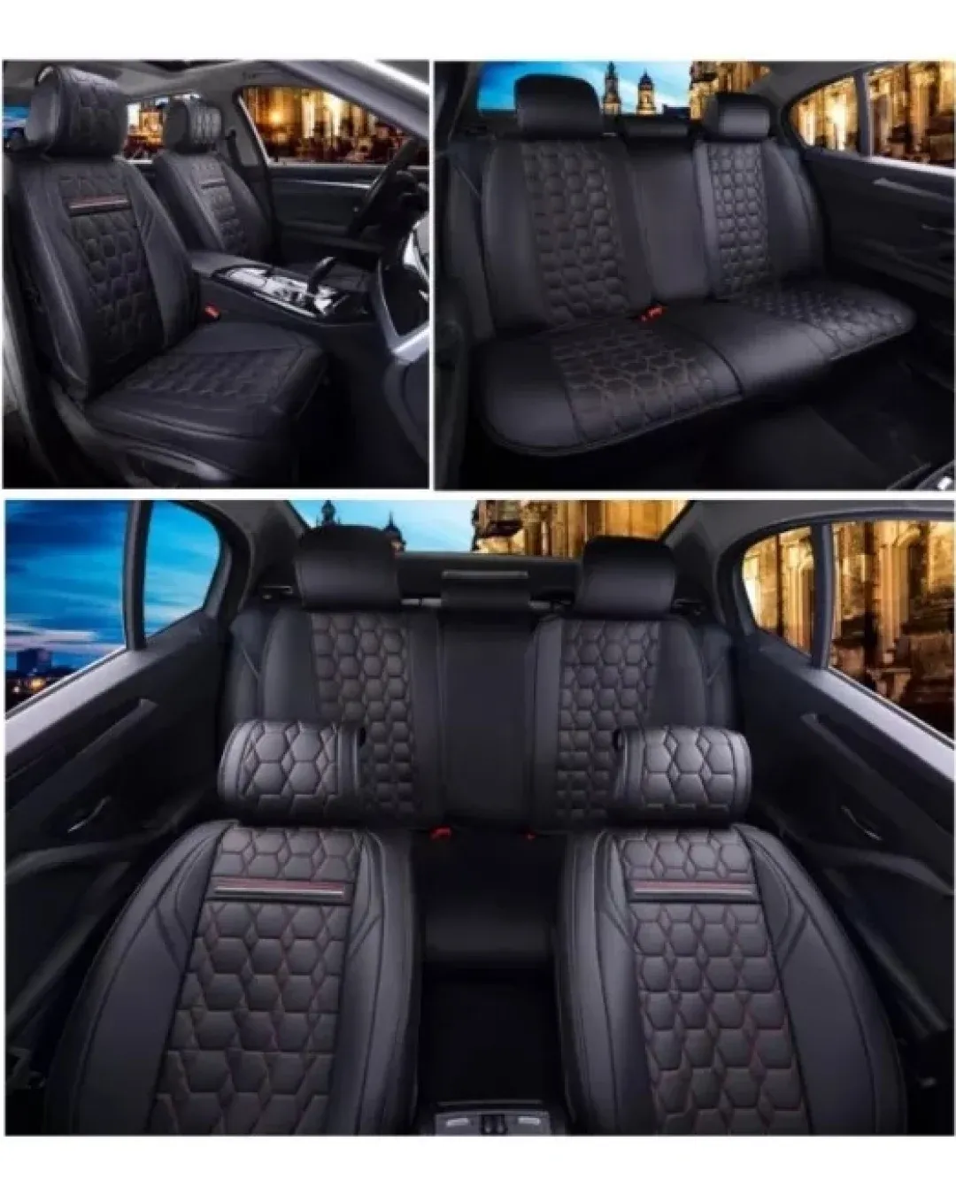 Луксозна тапицерия Изработени от висококачествена PU изкуствена кожа и мека пяна, осигуряват удобно чувство за сядане. Ръчно шити. Универсален дизайн, подходящ за всички автомобили. Дизайн, съвместим с airbag - въздушни възглавници. Устойчивост на износване, добър водоустойчив ефект и силна огнезащитна способност. Лесна инсталация. Цялостен дизайн, покрива предната и задната част на седалката. Пакет, включващ: 5 части