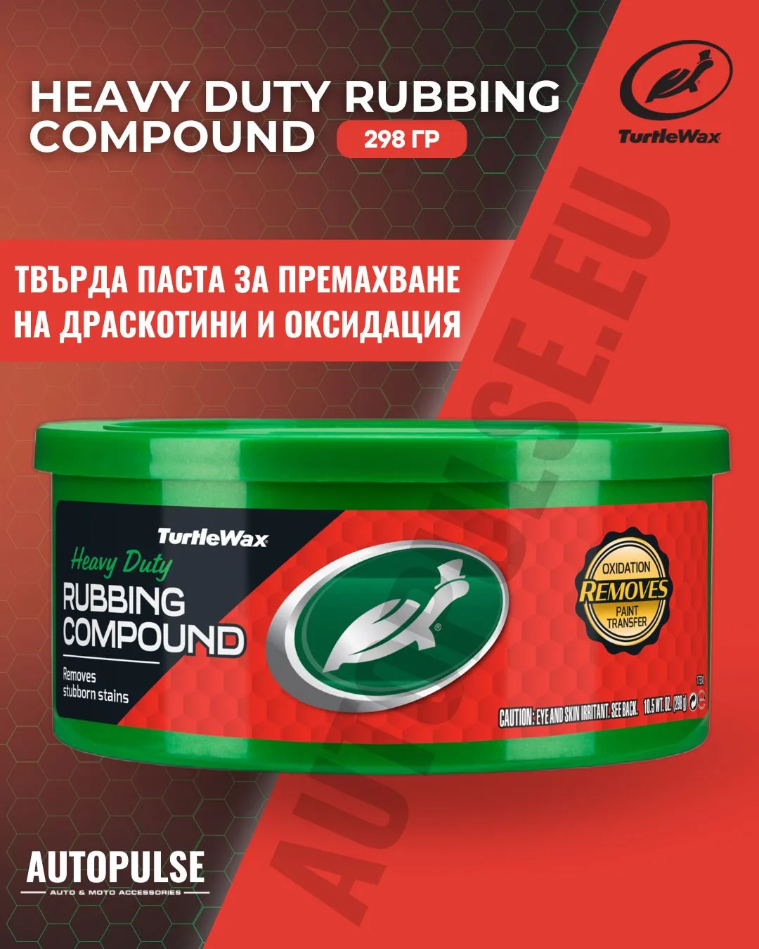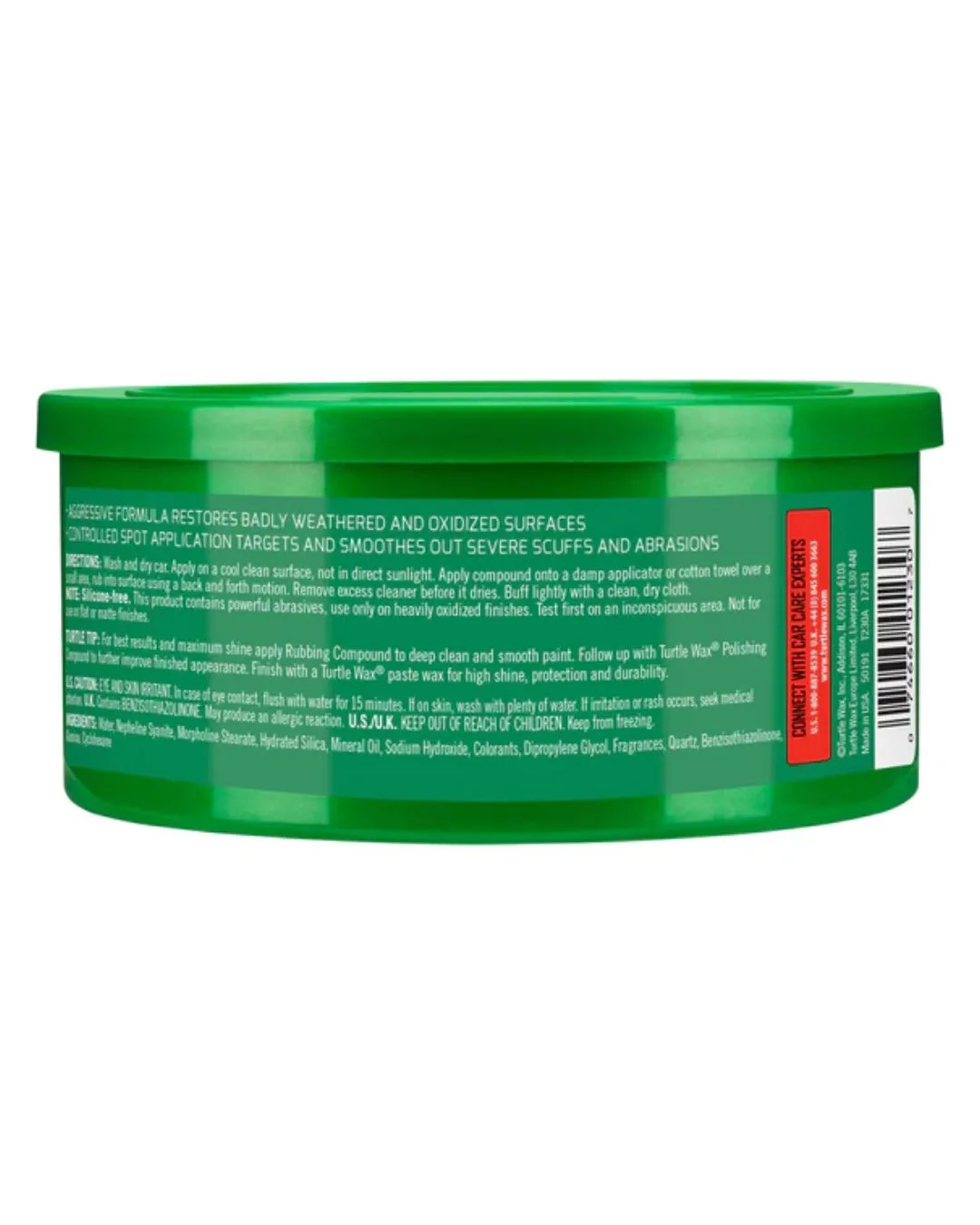 Turtle Wax Rubbing Compound е твърда паста (Heavy Duty Compound) с нетно тегло 298 грама. Продуктът е създаден като абразивен почистващ агент, без да съдържа карнауба восък или други защитни филъри, тъй като основната му цел е корекция и почистване. Формулата е с агресивна почистваща сила, което изисква внимателна употреба само върху силно увредени или окислени зони. Той е подходящ за точкова обработка (spot application) на дефекти или за цялостно възстановяване на силно захабен лак.