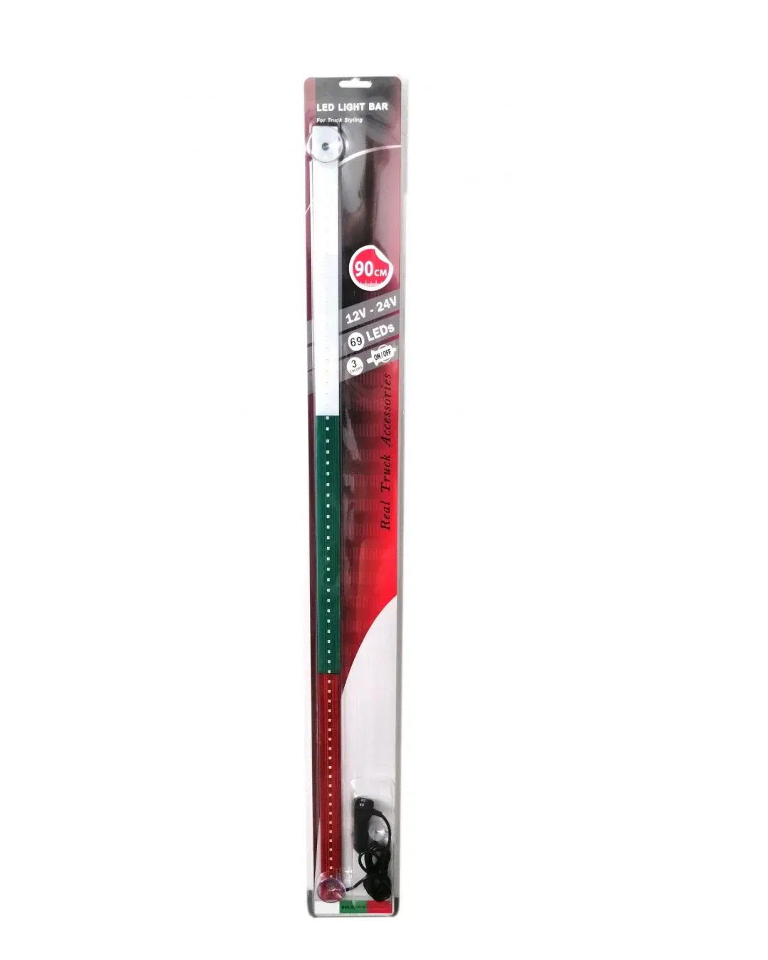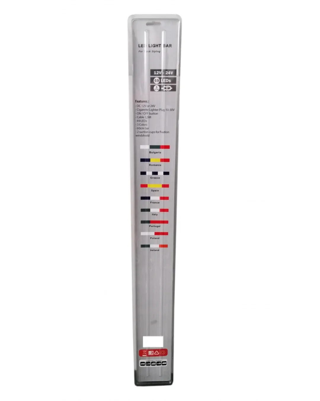 Нов дизайн и идея, придаващи фантастичен облик на Вашия автомобил, камион, бус и др.Изключително ЛЕСНА инсталацияВолтаж : 12V - 24VДължина 90cm69 светодиода с ON/OFFЩепсел за запалка150 см дължина на кабелаЗакрепване 2бр. вендузи за стъклото
