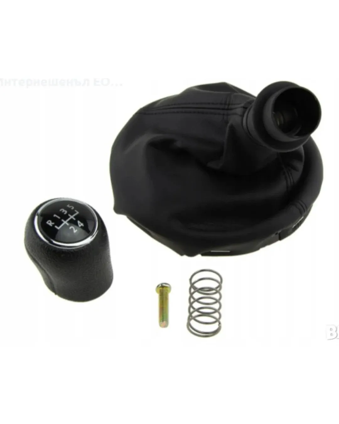 Комплект топка за скоростен лост с маншон, съвместим с VW Transporter T5, Multivan T5, Caravelle T5. Предназначен за подмяна на износен или повреден компонент, като възстановява оригиналната визия и удобството при превключване на предавките. Маншонът е изработен от еко кожа с двоен шев. Топката е с обозначена схема на превключване за 5-степена ръчна трансмисия.