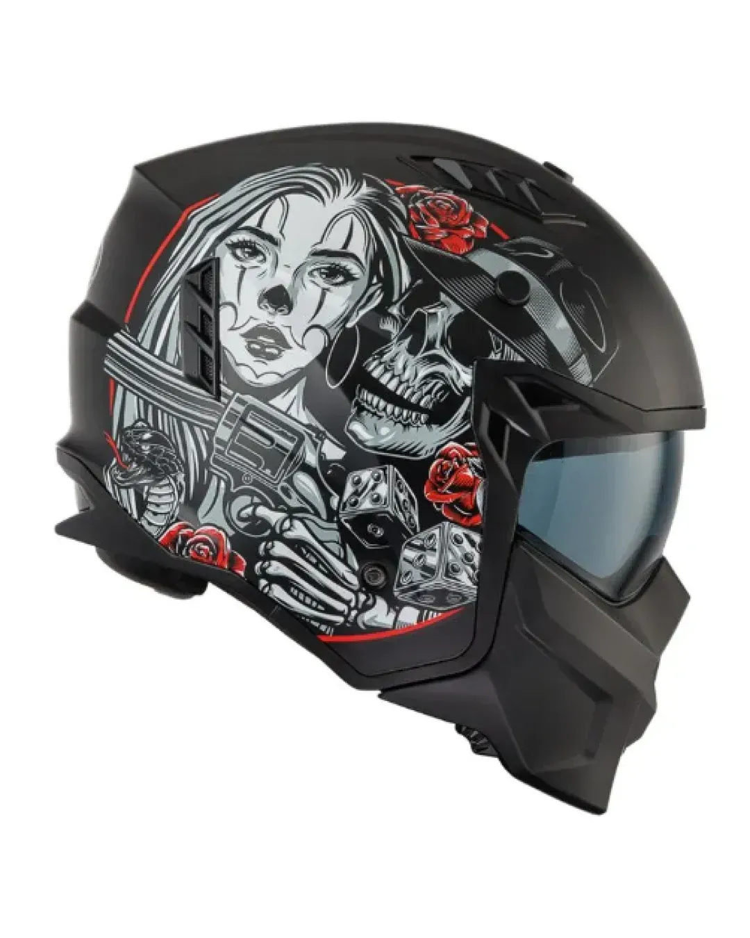 - Вътрешният визьор работи като слънчеви очила и може да се повдига вътре в черупката.