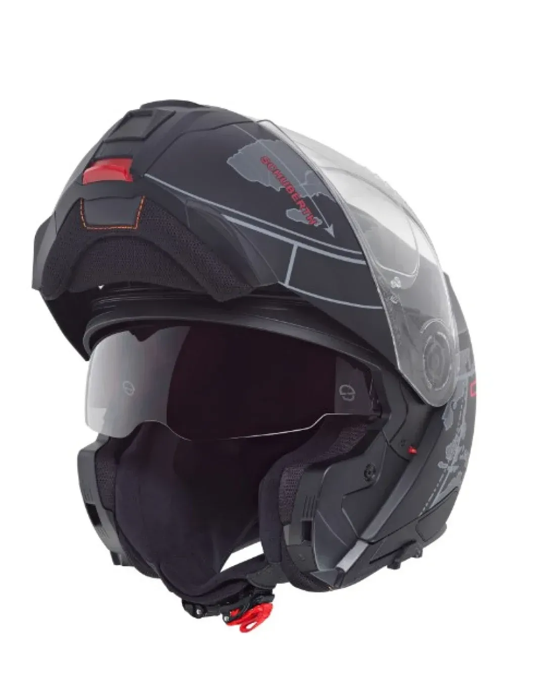 - светлоотразителни зони върху ветрозащитния елемент, подложката за врата, уплътнението на визьора и стикерите на каската за подобрена видимост при каране с отворена и затворена част на брадичката