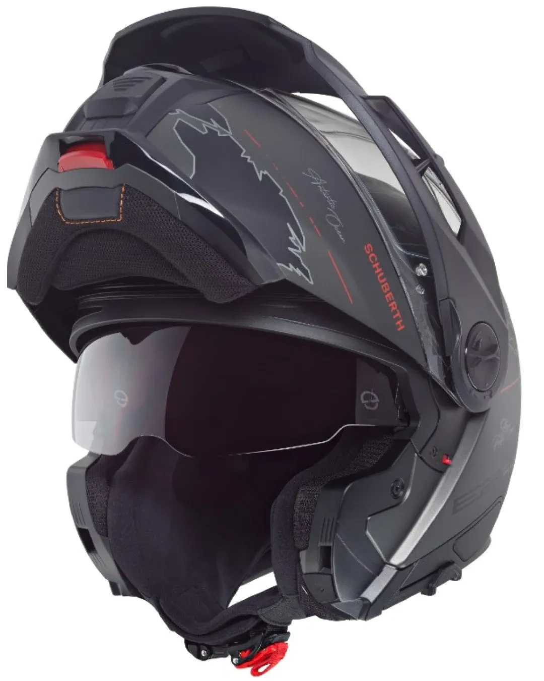 - Малките детайли са тези, които правят разликата между обикновената каска и тази на SCHUBERTH. Въведената функция на визьора на E1 за фиксиране, присъства и в новият модел E2. Каквато и позиция на визьора да сте избрали, ще се запази при отваряне и затваряне на брадичката.
