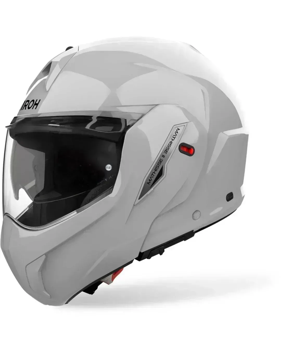 Airoh Mathisse II Cement Grey Gloss е модуларна каска от ново поколение, тип flip-up (отваряема), чийто механизъм позволява на брадичката да се завърта на 180 градуса плътно назад. Този дизайн я прави изключително аеродинамична и балансирана, когато е отворена.