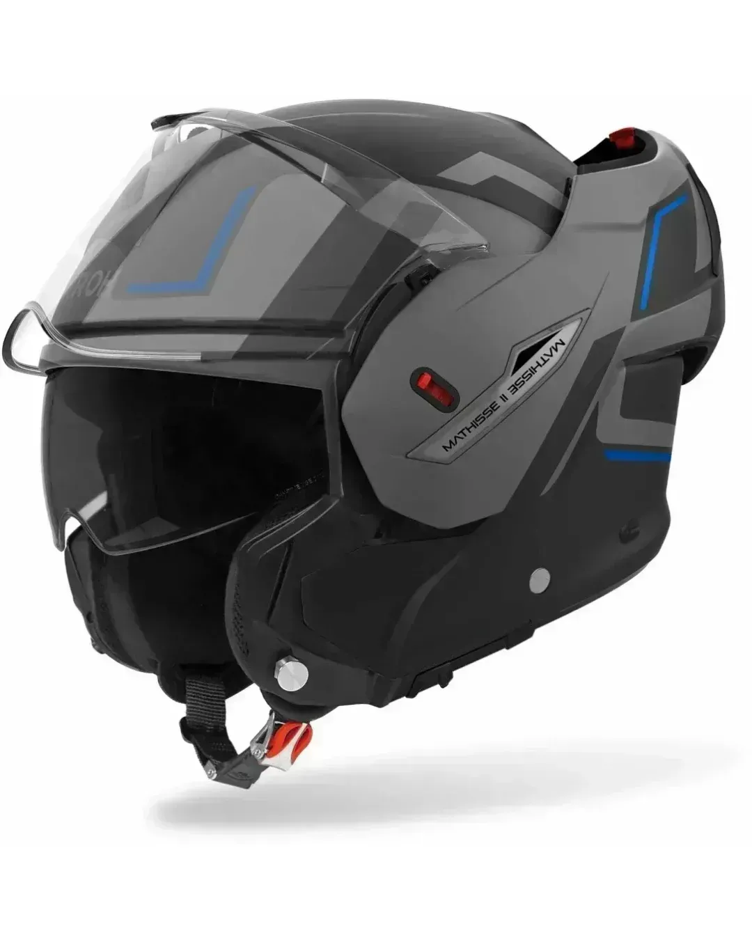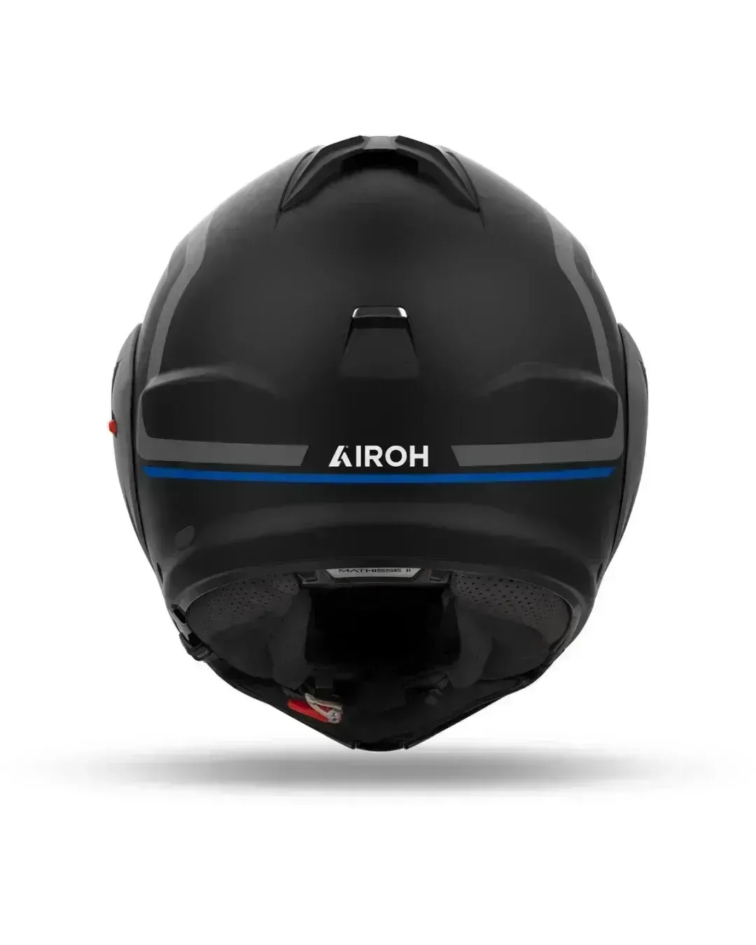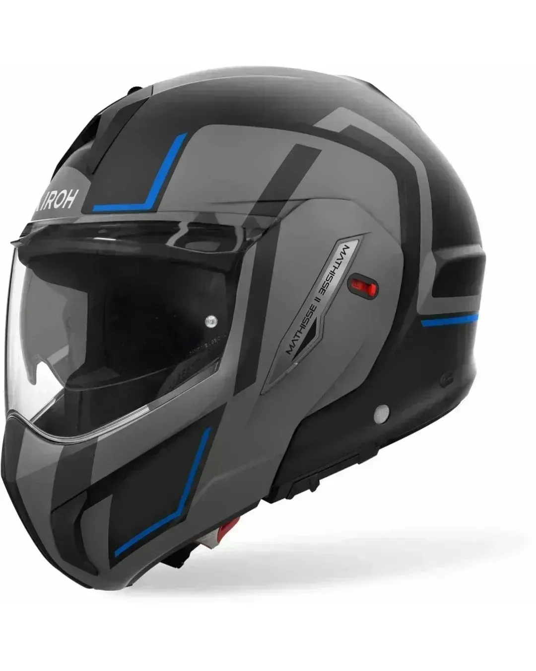 Airoh Mathisse II Genius Blue Matt е високотехнологична модуларна (flip-up) каска, която се отличава с механизъм за отваряне на брадичката на 180 градуса. Тя е проектирана като решение „2 в 1“, позволяващо на моториста да я използва както като затворена (Full Face), така и като напълно отворена (Jet) каска, благодарение на двойната си P/J хомологация.